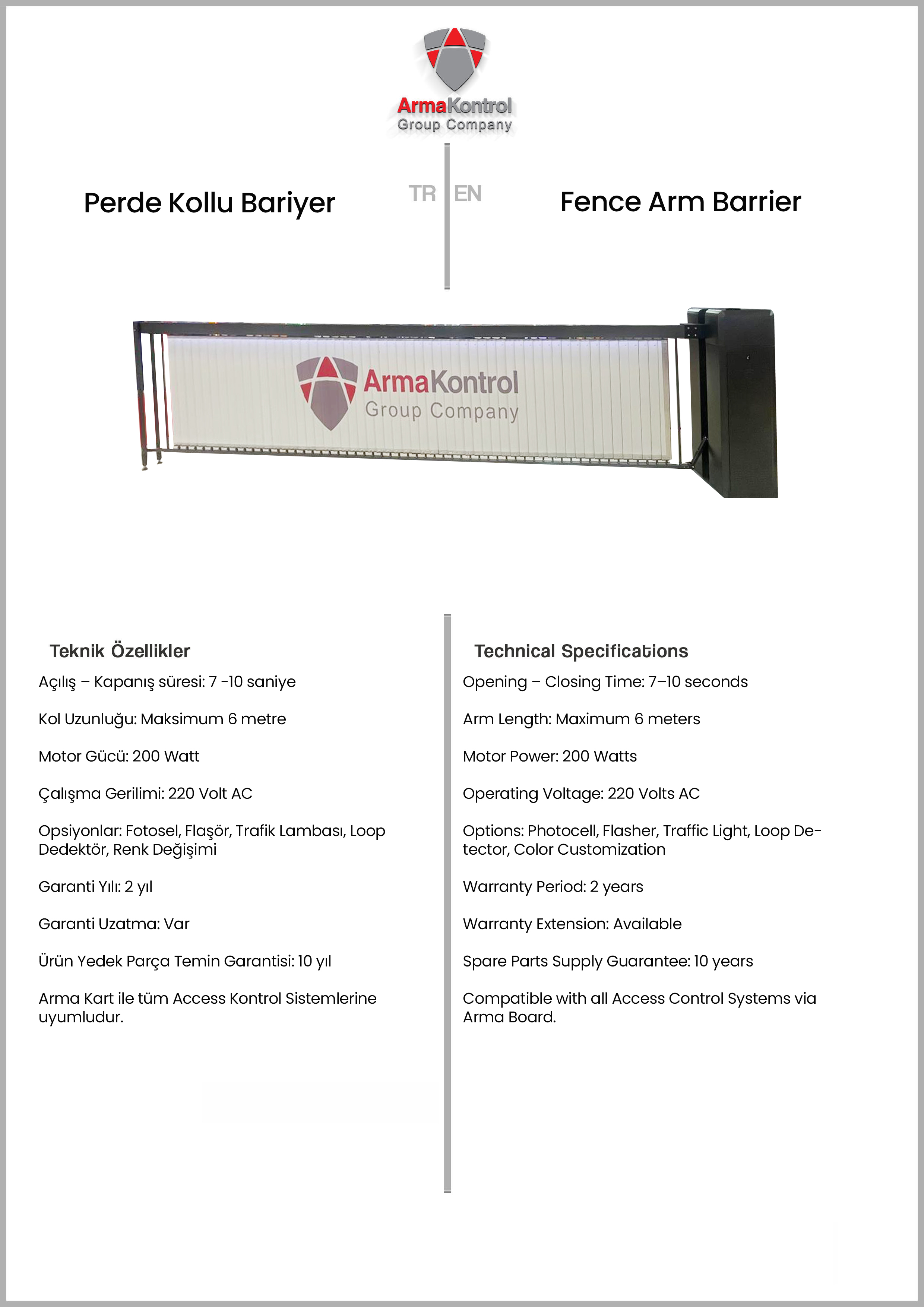 Fence Arm Barriers feature an aesthetic design, a weather-resistant outer cabinet, and a powerful motor, ensuring international standards and quality. Thanks to the photocells on the barrier, vehicle passage is detected, and the barrier arm remains open until the vehicle fully passes, preventing possible accidents. The barrier can be controlled via optional accessories such as remote control, manual button, card reader, license plate recognition, HGS-OGS, mobile control, or GSM. Depending on the entrance width, different arm lengths can be used, with a maximum length of up to 6 meters.