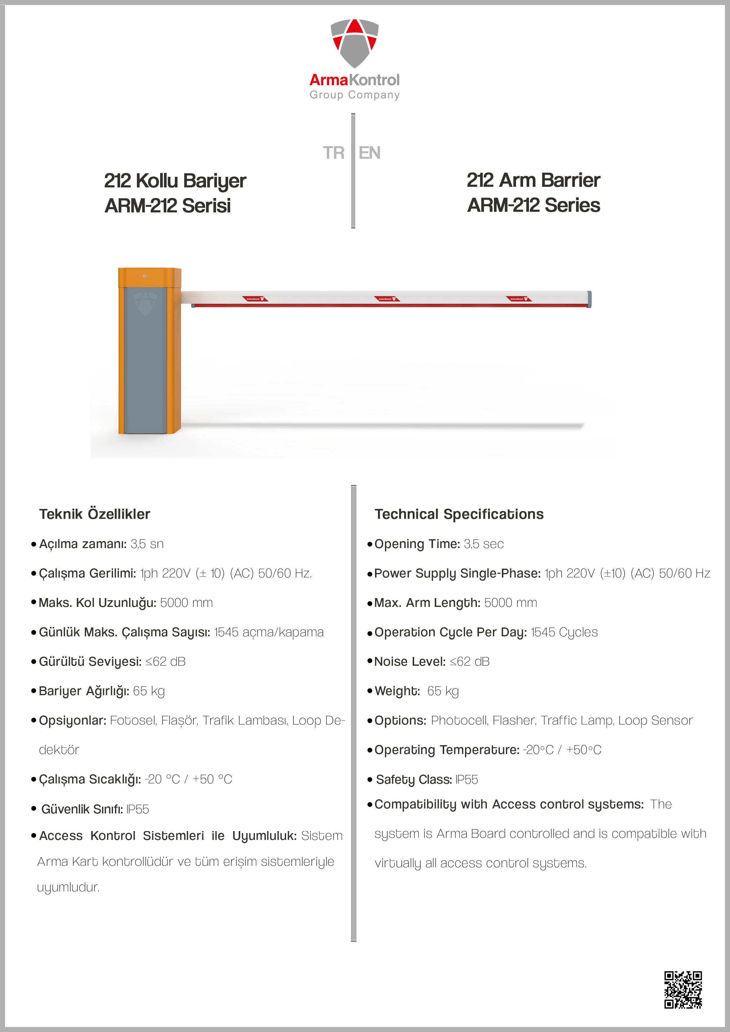 Arma 212 Arm Barriers have an aesthetic appearance, a weather-proof outdoor cabin, a powerful engine, and are produced to international quality standards. Photocells on the barrier detect vehicles passing through, preventing the barrier lever from closing and any possible accidents that might arise. If desired, the barrier can be controlled with alternative accessories such as remote controls, manual buttons, card readers, license plate recognition, HGS-OGS, other mobile controls, and different lever lengths can be used depending on vehicle width.