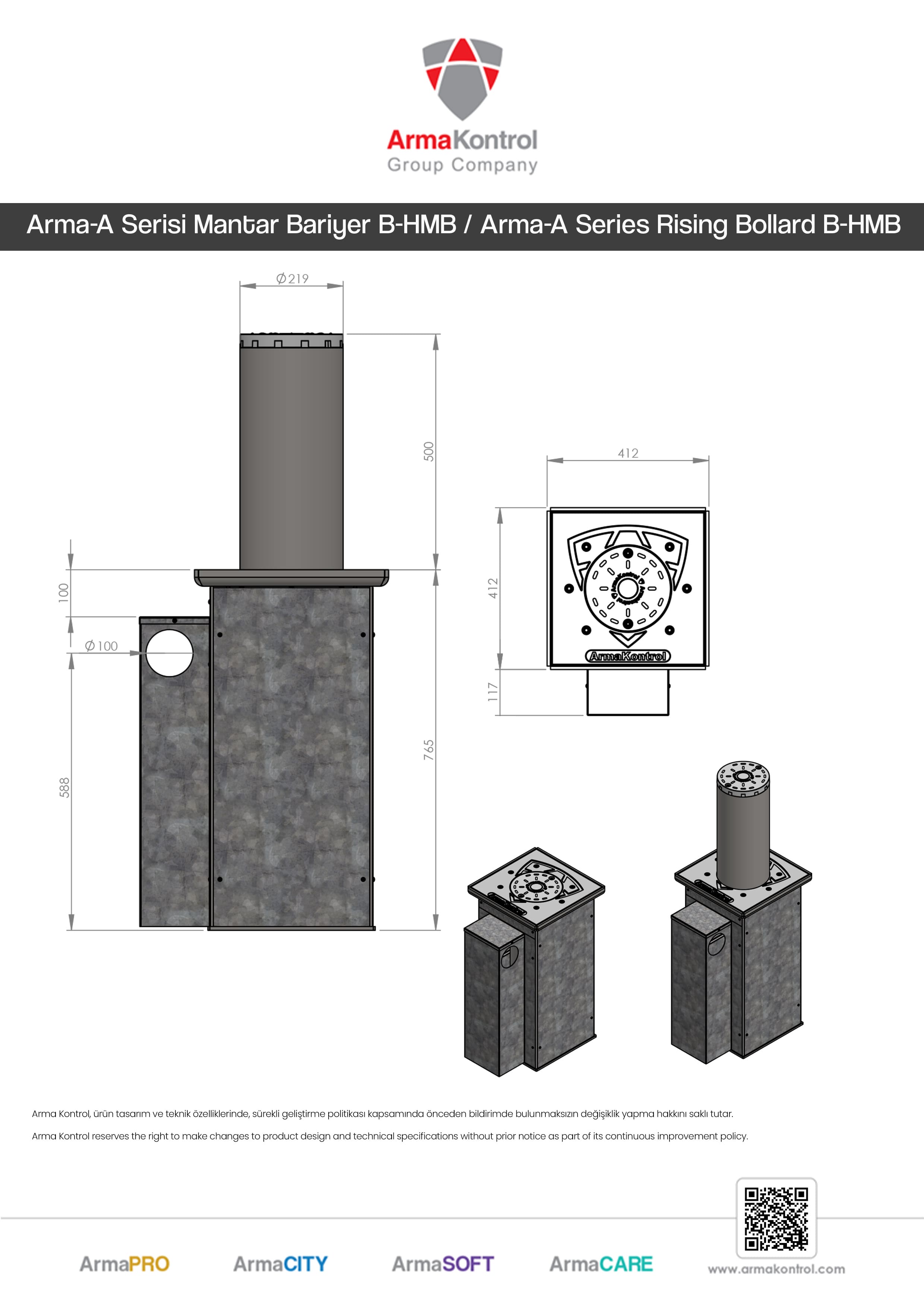 Arma A Serisi Hidrolik Mantar Bariyerler darbeye ve hava koşullarına dayanıklı, Avrupa normu çelik çekme borulardan üretilerek paslanmaz özelliği ile de uzun yıllar sorunsuz çalışmaktadır. Güçlendirilmiş iç yapısı ile tasarlanmış Mantar Bariyerler yetkisiz araçların giriş-çıkışlarını engellemektedir