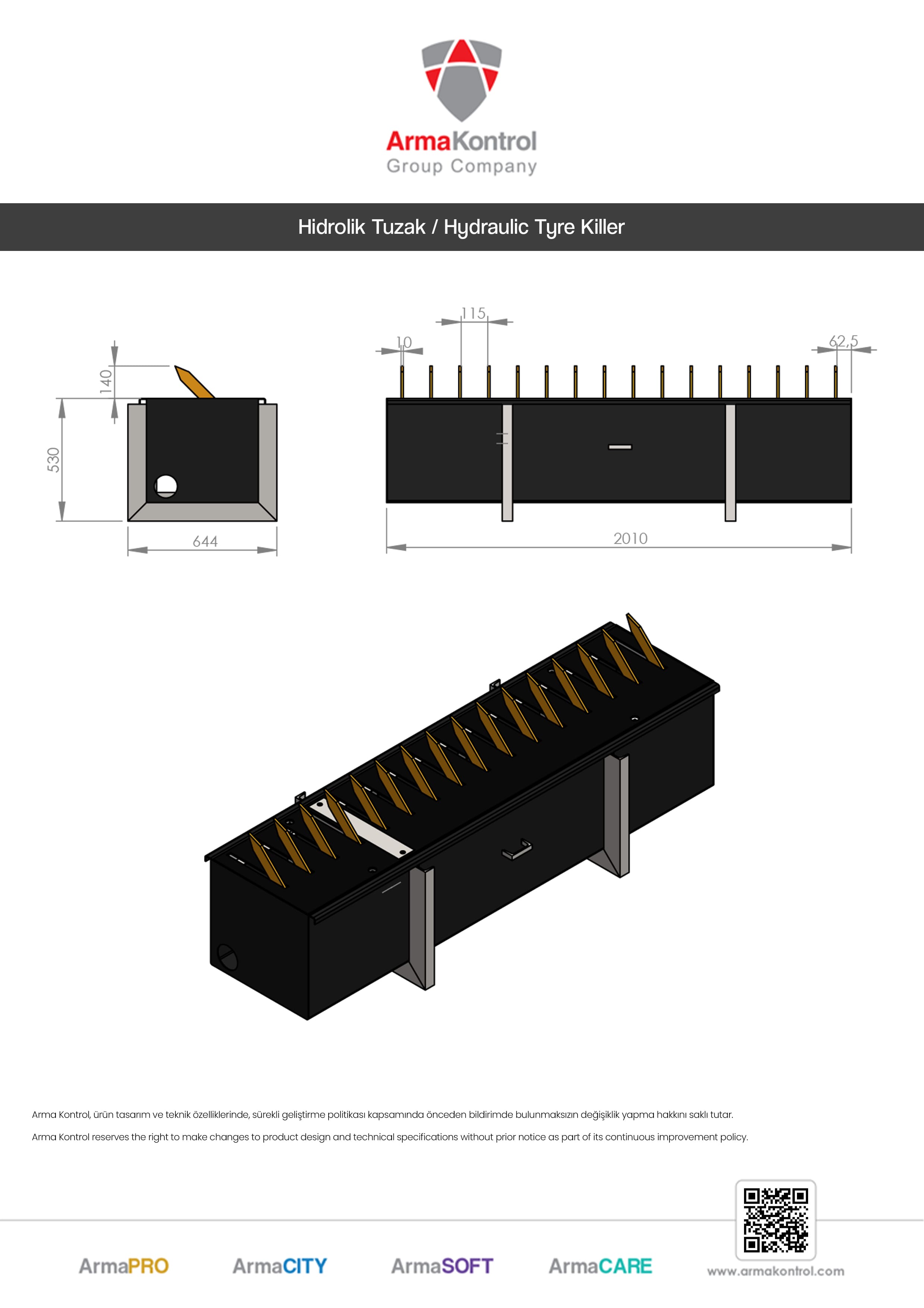 Arma Kontrol Hidrolik Yer Tuzağı otopark, alışveriş merkezleri, siteler, tek yönlü yollar vb. alanlarda ulaşımın tek yönde yapılmasını sağlayıp, ters yönden geçişi engellemek için kullanılır. İstenildiğinde pasif hale getirilebilir. Mevcut geçiş düzenine aykırı hareket eden araçlar, manuel yer tuzakları, birbirinden bağımsız bıçakları sayesinde engellenip, herhangi bir suikast girişiminde lastik hasarına neden olmaktadır. Bıçaklar 7 cm olup, müşteri taleplerine göre özel ölçülerde üretim yapılabilmektedir. Bıçaklarda çarpmayla ortaya çıkan ses şiddeti, özel kauçuklarla azaltılmıştır. Dış etkenlere karşı dayanıklılığını arttırmak için epoksi boya veya elektrostatik toz boya boyanmaktadırlar.