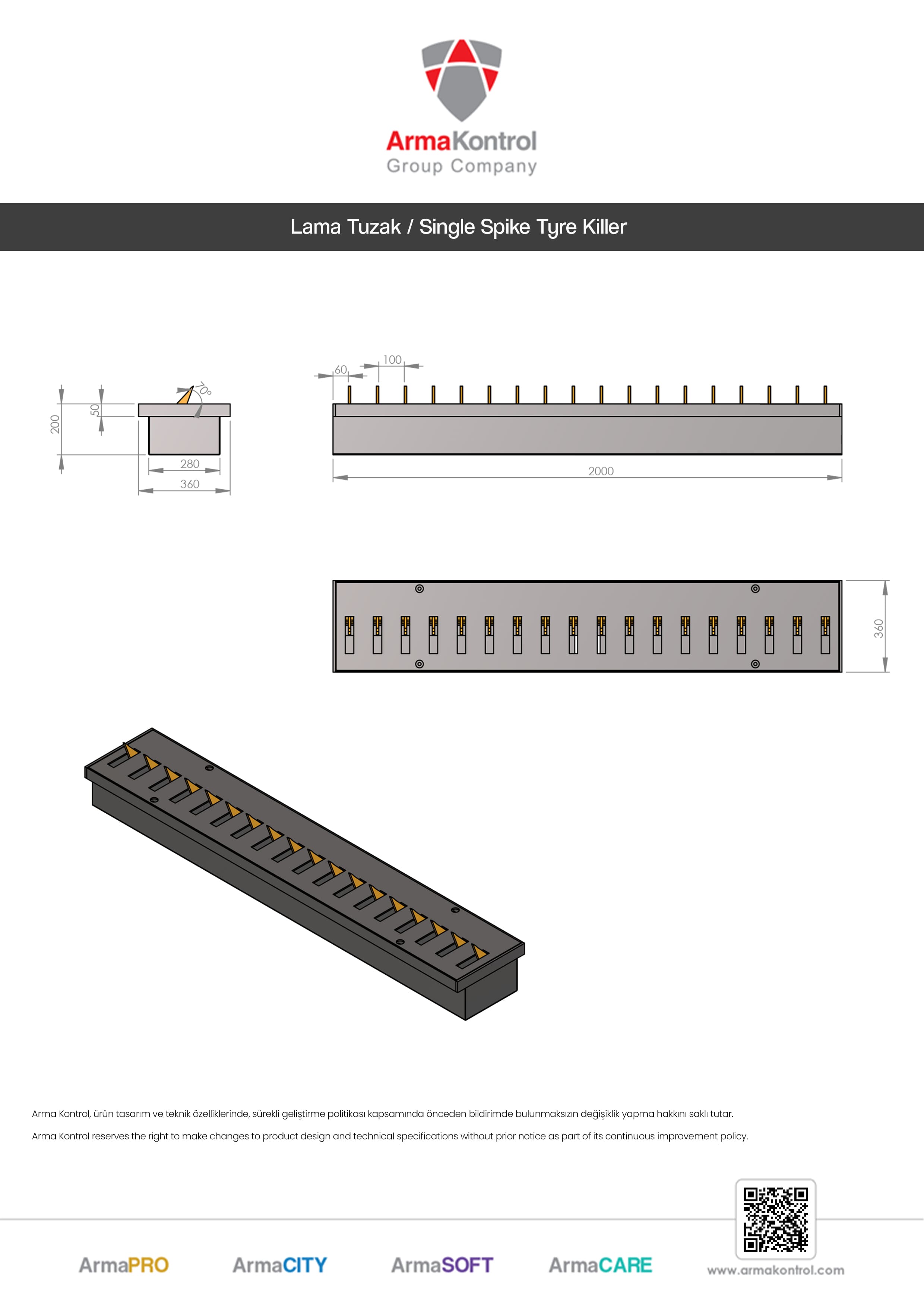 Arma Kontrol Lama Yer Tuzağı otopark, alışveriş merkezleri, siteler vb. alanların araç giriş-çıkış noktalarında ulaşımın tek yönde yapılmasını sağlayıp, hızlı ve güvenli bir geçiş ortamı oluşturur. Bu sistemin amacı ters istikamette araç geçişini engellemektir. Mevcut geçiş düzenine aykırı hareket eden araçlar, Manuel Yer Tuzakları, birbirinden bağımsız bıçakları sayesinde engellenip, herhangi bir suikast girişiminde lastik hasarına neden olmaktadır. Bıçaklar 7 cm olup, müşteri taleplerine göre özel ölçülerde üretim yapılabilmektedir. Bu bıçaklarda çarpmayla ortaya çıkan ses şiddeti, özel kauçuklarla azaltılmıştır. Ürün boyası olarak, kalite anlayışımızdan dolayı dış etkenlere dayanıklı epoksi boya veya elektrostatik toz boya kullanılmaktadır.