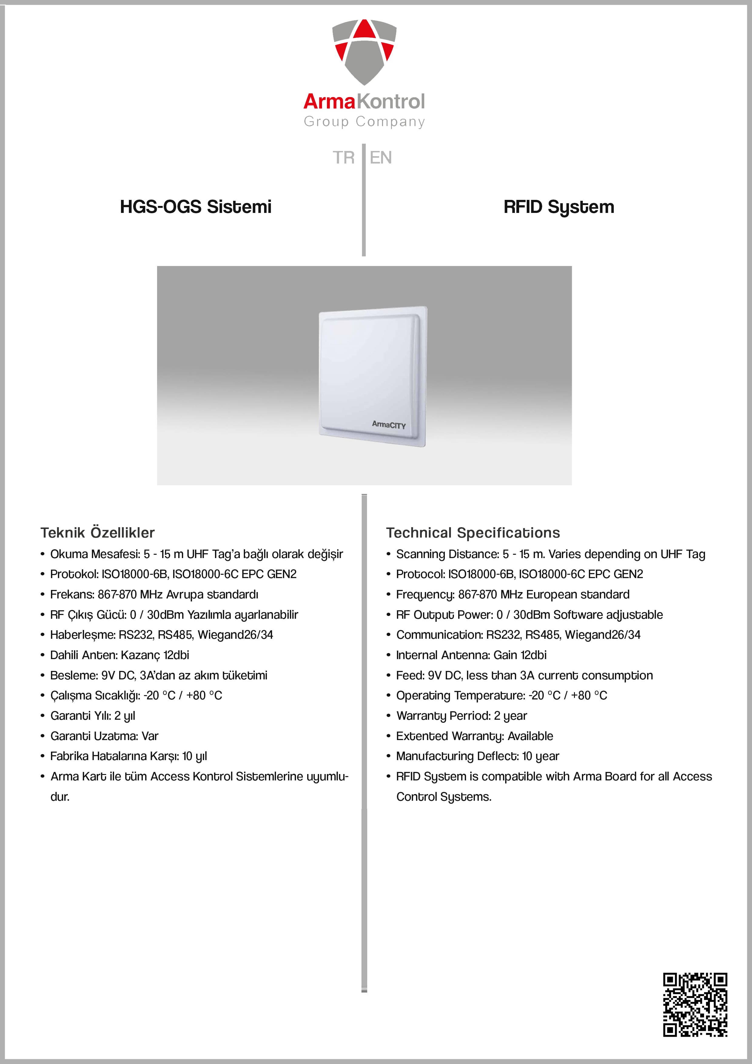 Arma Kontrol HGS-OGS (RFID) otopark geçiş kontrol sistemi, kart ve kumanda kullanımına gerek olmadan uzaktan otomatik geçişi sağlar. Yetkisiz girişleri engeller ve Türkçe ve İngilizce kullanıcı dostu arayüz yazılımıyla otopark giriş-çıkışlarınızı kolayca yönetmenizi sağlar. Bu sistem, site, iş yeri veya abone otoparkı gibi çeşitli alanlarda kullanılabilir.