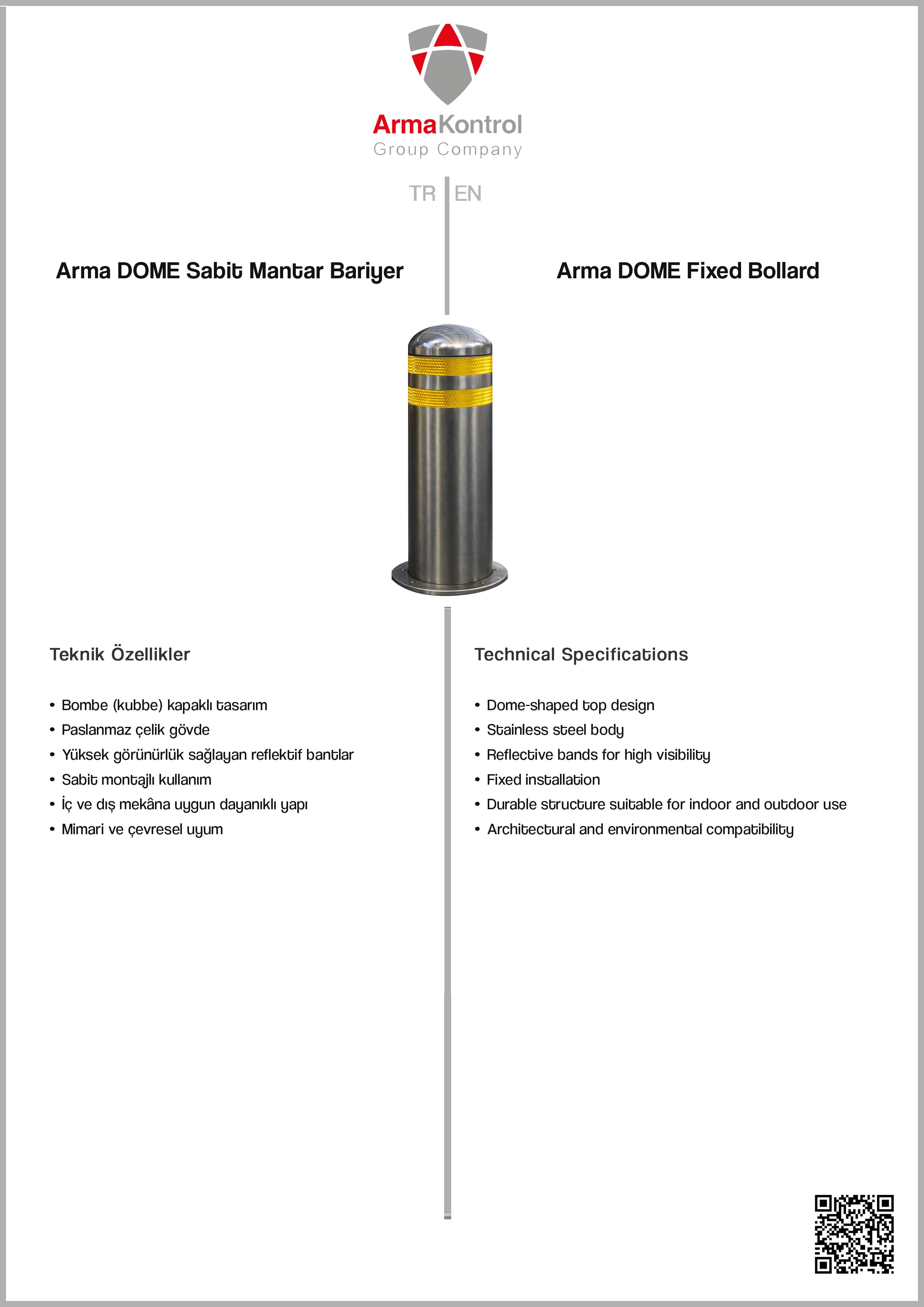ArmaDOME is a fixed bollard solution designed with a dome-shaped top, a stainless steel body, and reflective bands that enhance night-time visibility. Its durable structure provides long-lasting area control in locations where vehicle traffic needs to be managed.