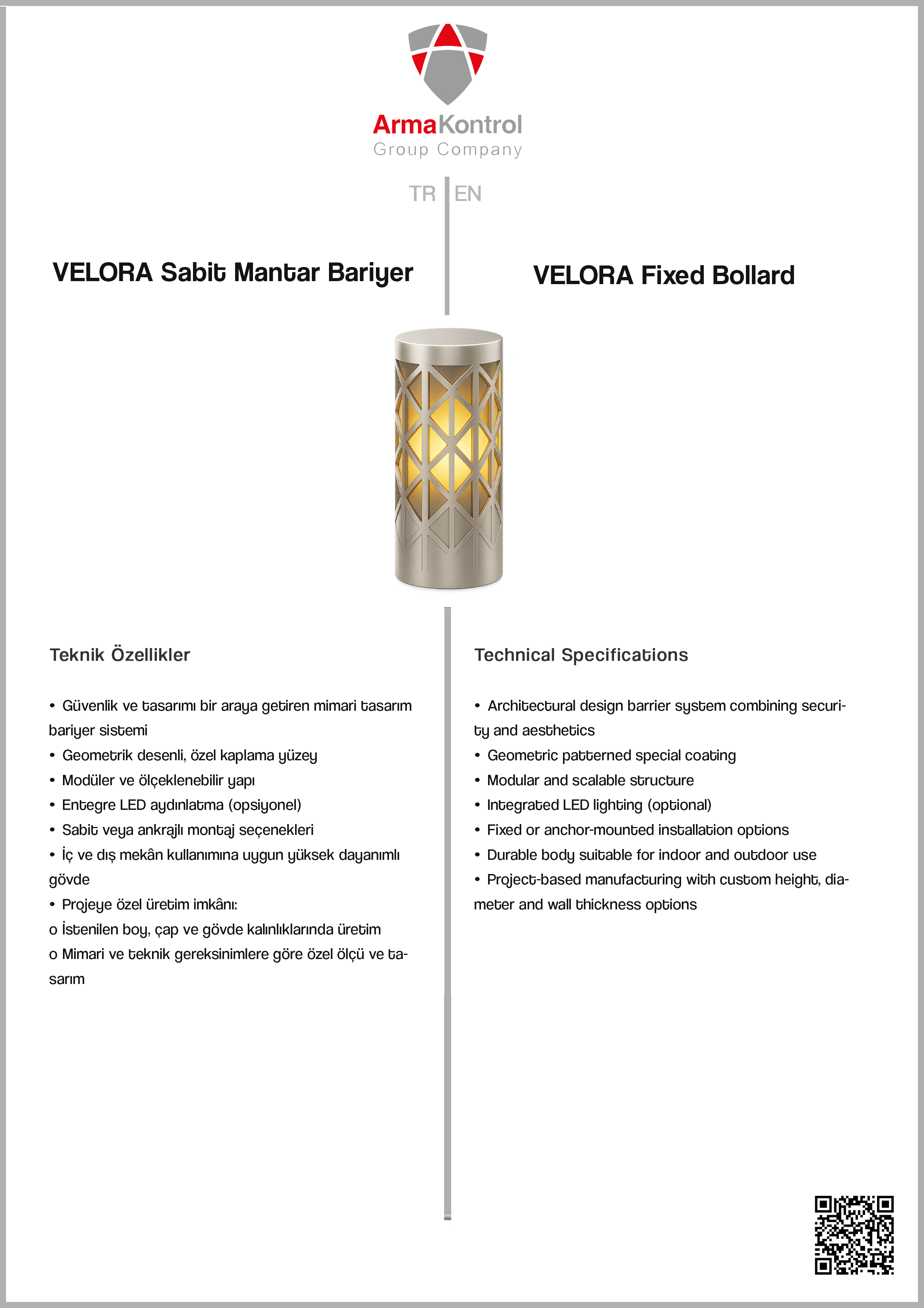 With its cylindrical form, geometric patterned surface, and integrated internal lighting, VELORA creates a strong visual presence both day and night. The harmony between light, form, and pattern elevates the product beyond a conventional security element, making it an integral part of the architectural composition.