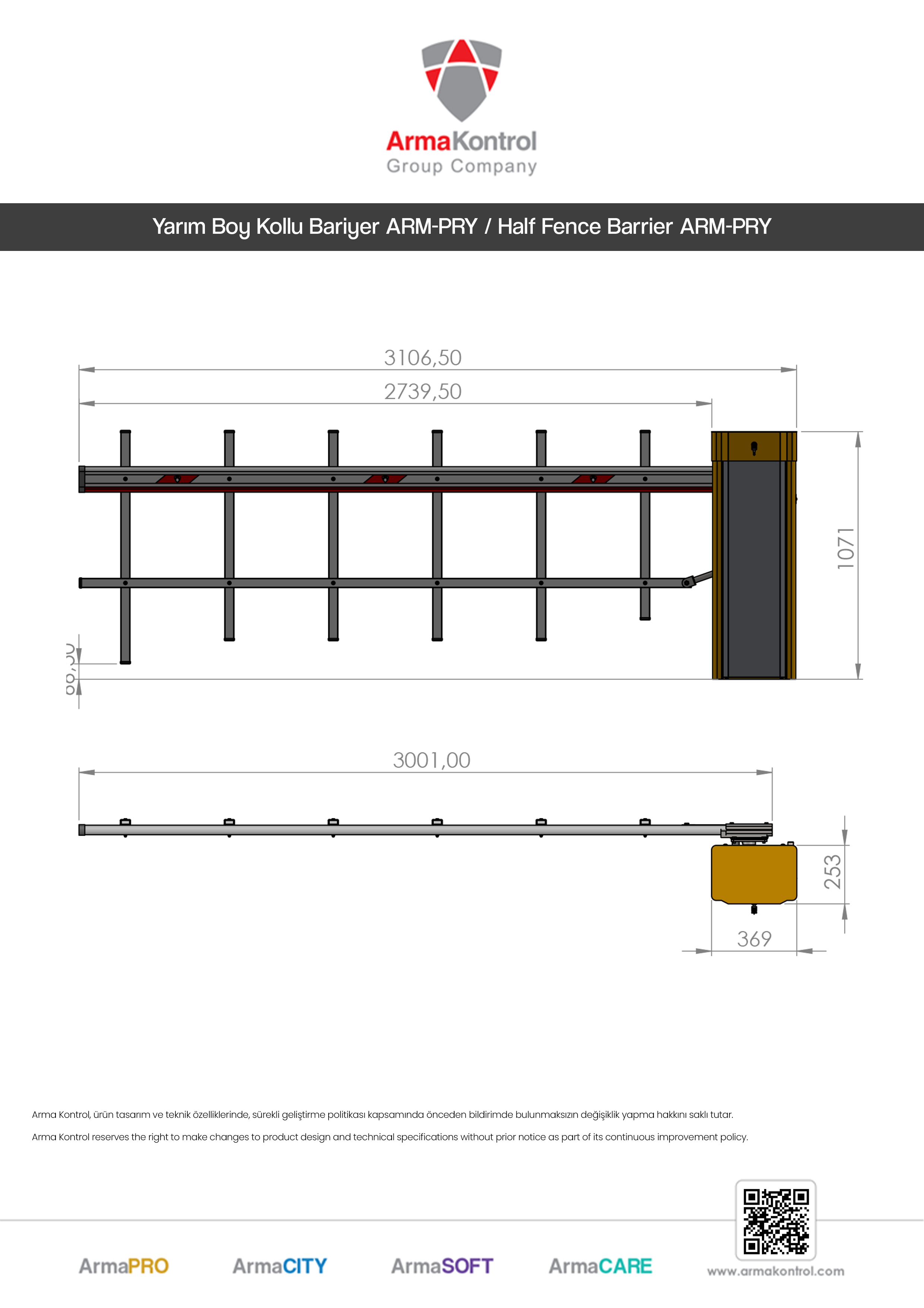 Arma Half Fence Barriers have an aesthetic appearance, a weather-proof outdoor cabin, a powerful engine, and are produced to international quality standards. Photocells on the barrier detect vehicles passing through, preventing the barrier lever from closing and any possible accidents that might arise. If desired, the barrier can be controlled with alternative accessories such as remote controls, manual buttons, card readers, license plate recognition, RFID, other mobile controls, and different lever lengths can be used depending on entrance width.