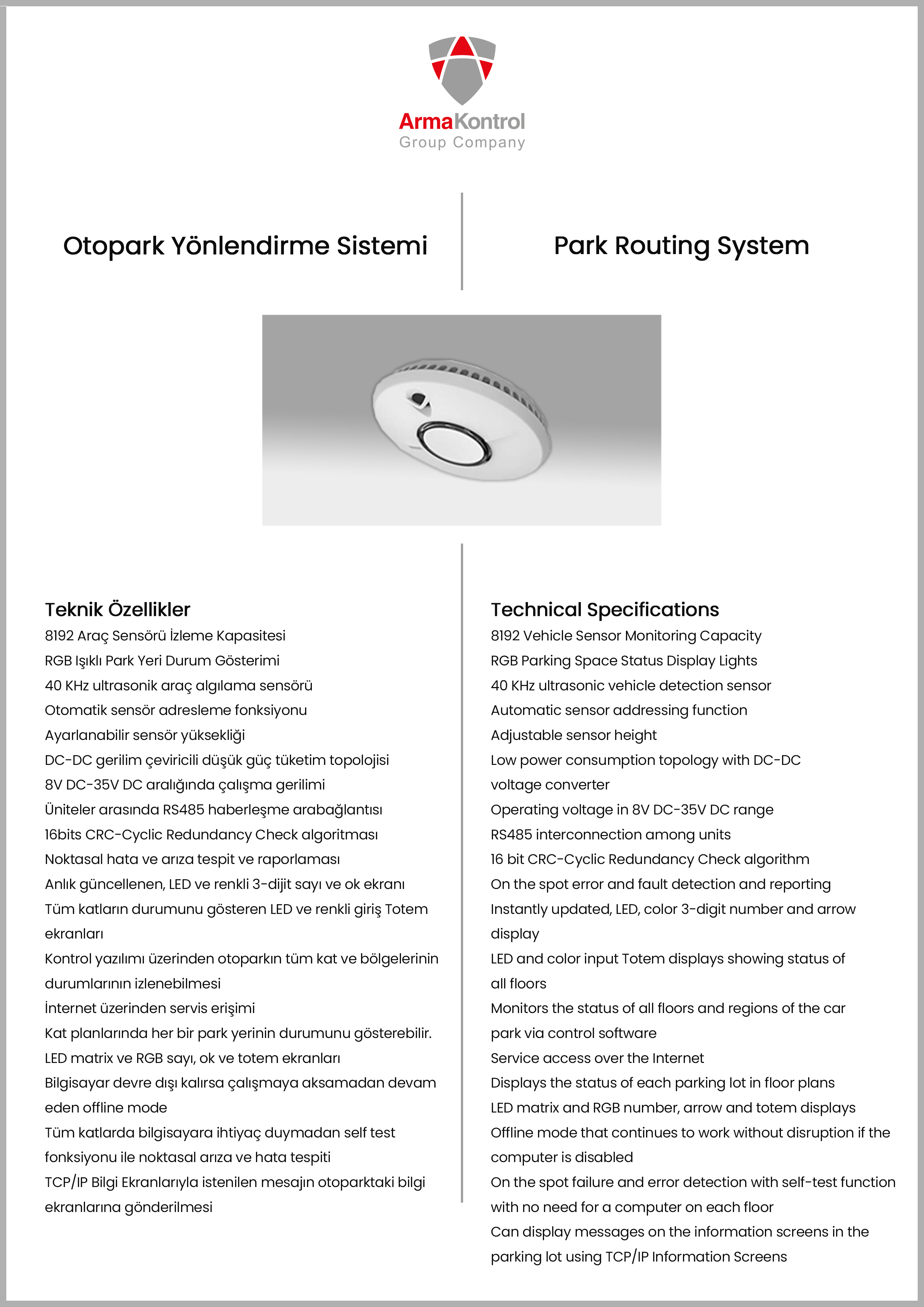 The Arma Kontrol Park Routing System is designed to prevent drivers from wasting unnecessary time and fuel in the parking lot. This smart park routing system guides drivers from their start point to the closest parking spot using dynamic directional arrows, screens that show the number of empty parking spaces, and parking status lights suspended above each parking space.