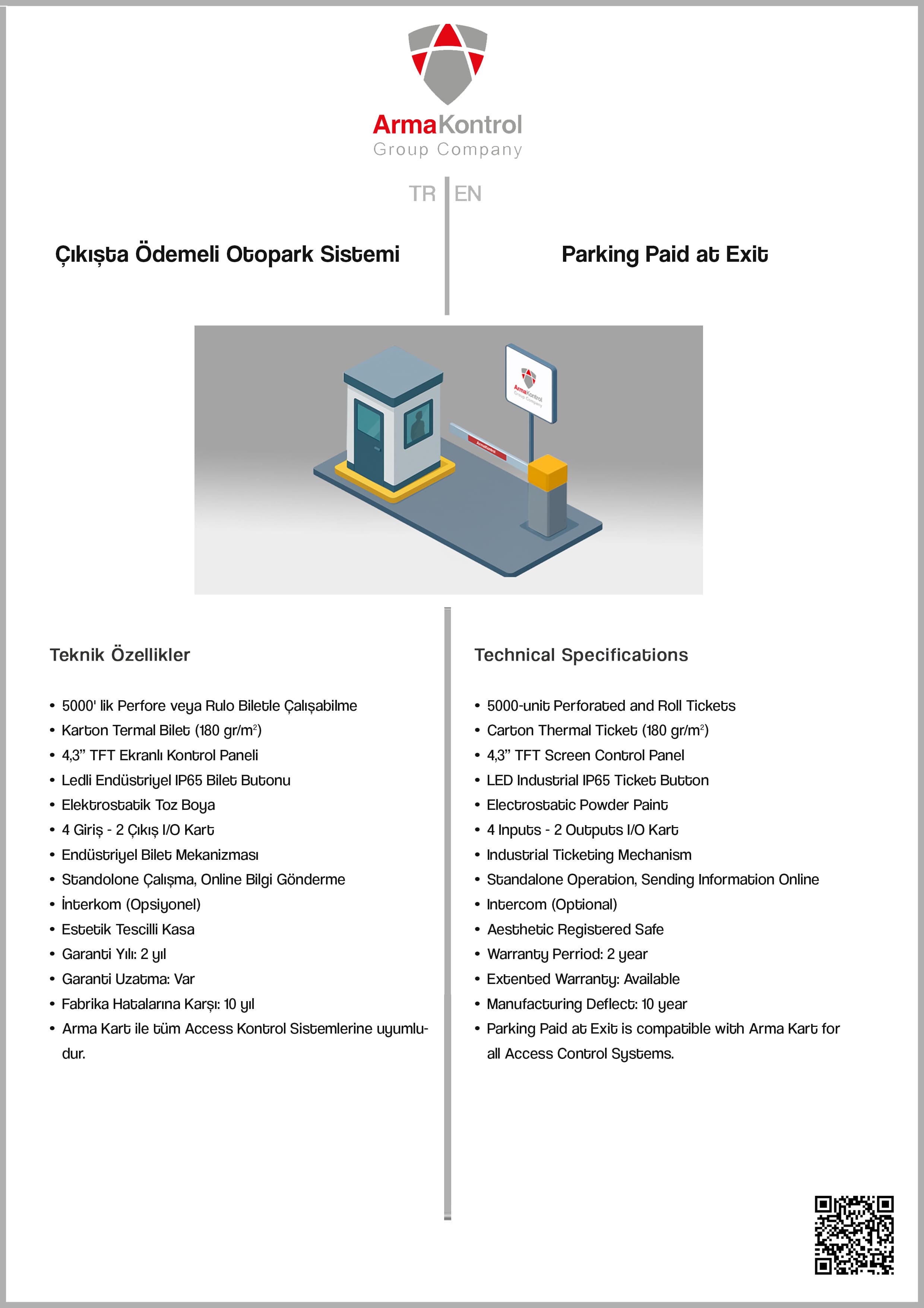 Arma Kontrol manufactures security barrier systems as well as Parking Automation Systems. With its experienced team, Arma Control utilizes advanced technology to provide automatic billing and ensures profitability from your parking area. Prioritizing customer satisfaction with a quality-oriented approach, the company handles all processes from production to after-sales services in-house. Adaptability to change is crucial in Parking Systems, and Arma Parking Systems offer flexibility in integrating the latest technologies. Additionally, through R&D efforts, the company provides rapid and technological solutions to customers.