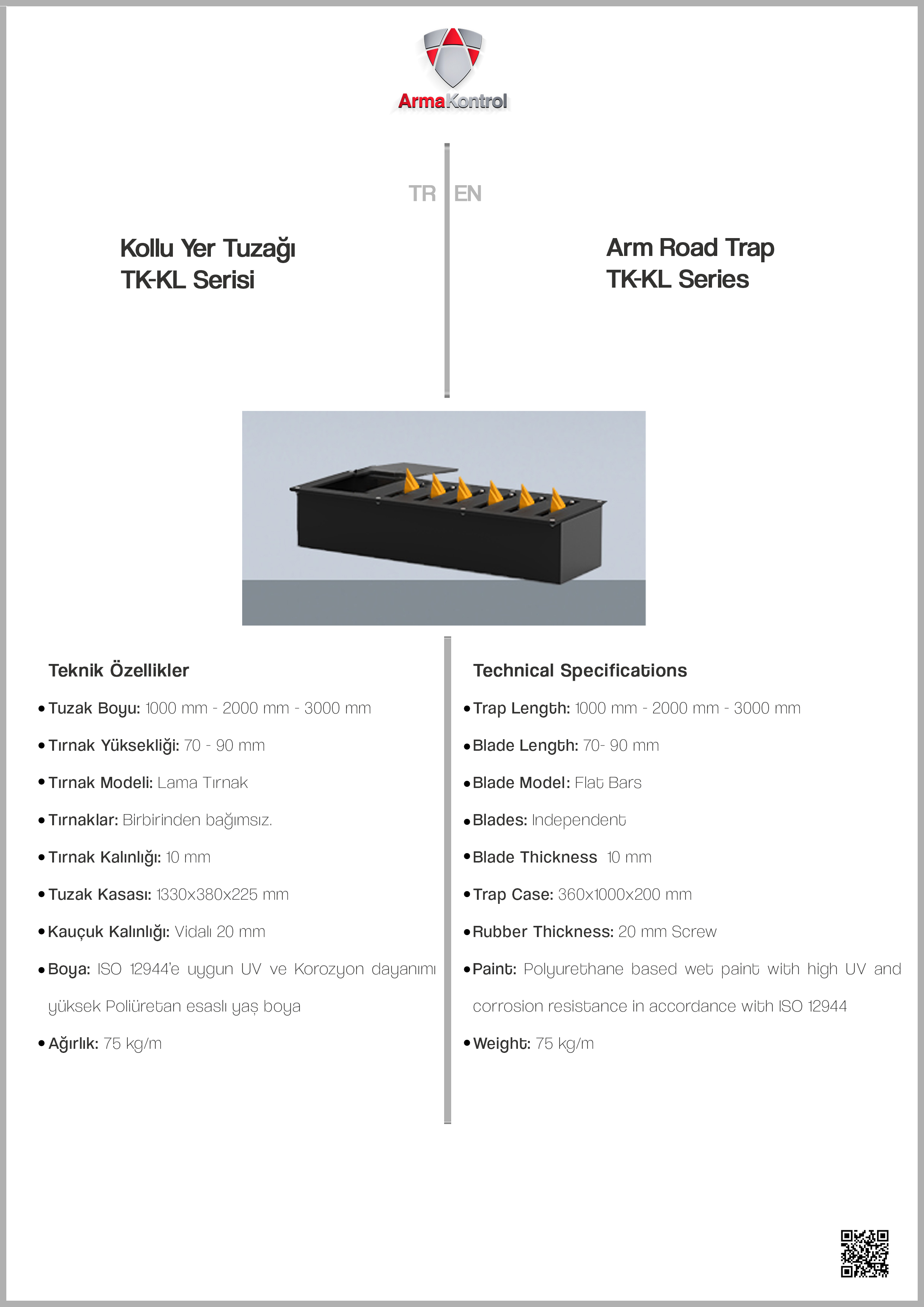 Arma Kontrol Single Spike Tyre Killers with Manual Lever are used to prevent entry from wrong access points in parking lots, shopping malls, apartment complexes, one-way roads, etc. It can be deactivated if desired. Tyre Killers with Manual Lever prevent entry by unauthorized vehicles by causing tire damage through its independent blades should such an attempt be made. The spikes are 7 cm but can be produced in special sizes to customer demands. Special rubber baffles reduce the sound intensity resulting from impact on these blades. We use epoxy paint or electrostatic powder paint resistant to external factors as part of our quality standard. The manual lever gives an additional option to lower the spikes manually if there is any need for that.