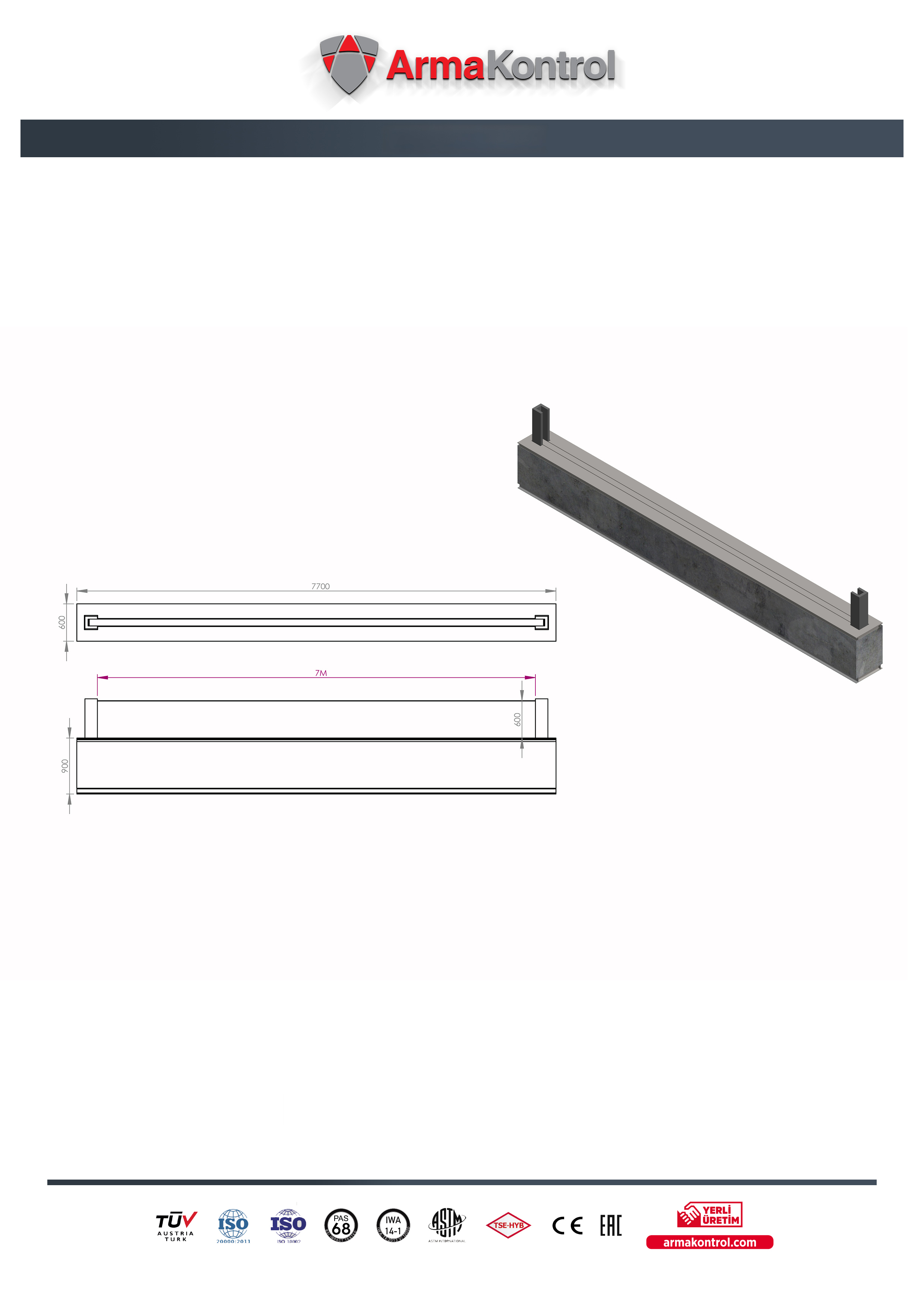 Güçlendirilmiş Zemin Üstü Sel Bariyeri, sel ve taşkınlardan zarar gören alanlar için tasarlanmış olup alt yapı sorunlarının olduğu yerler için ideal bir çözümdür. Ayrıca çevre koruma misyonu ile toprak kayması ve erozyon gibi doğal felaketlere karşıda kalkan görevi görmektedir. Yapılan analizler doğrultusunda rampa sonlarında, eski dere yataklarında, dar cadde, sokaklarda kalan fabrikalarda, sitelerde, kamu kurum ve kuruluşlarında, özel tesis binalarında ve eğimli girişi bulunan garajlarda kullanılmaktadır. Yerinde yapılan ölçümlerle analizlere bağlı olarak, Sel Bariyerinin mukavemet/ölçü hesaplamaları yapılıyor ve müşteriye özel üretim sunuyoruz. Bu kullanımlarının yanı sıra emniyet ve savunma duvarı olarak da büyük kayıpların yaşanmasını engelliyor. Çalışma prensibi hidrolik ve pnömatik olup, 24V(DC)/220V(AC)/380V(AC) çalışabilmektedir. Güneş enerjisi ve her türlü Access Kontrol Sistemi (GSM, OGS-HGS Sistemi, Kart Okuyucular vb.) ile entegre çalışmaktadır.
