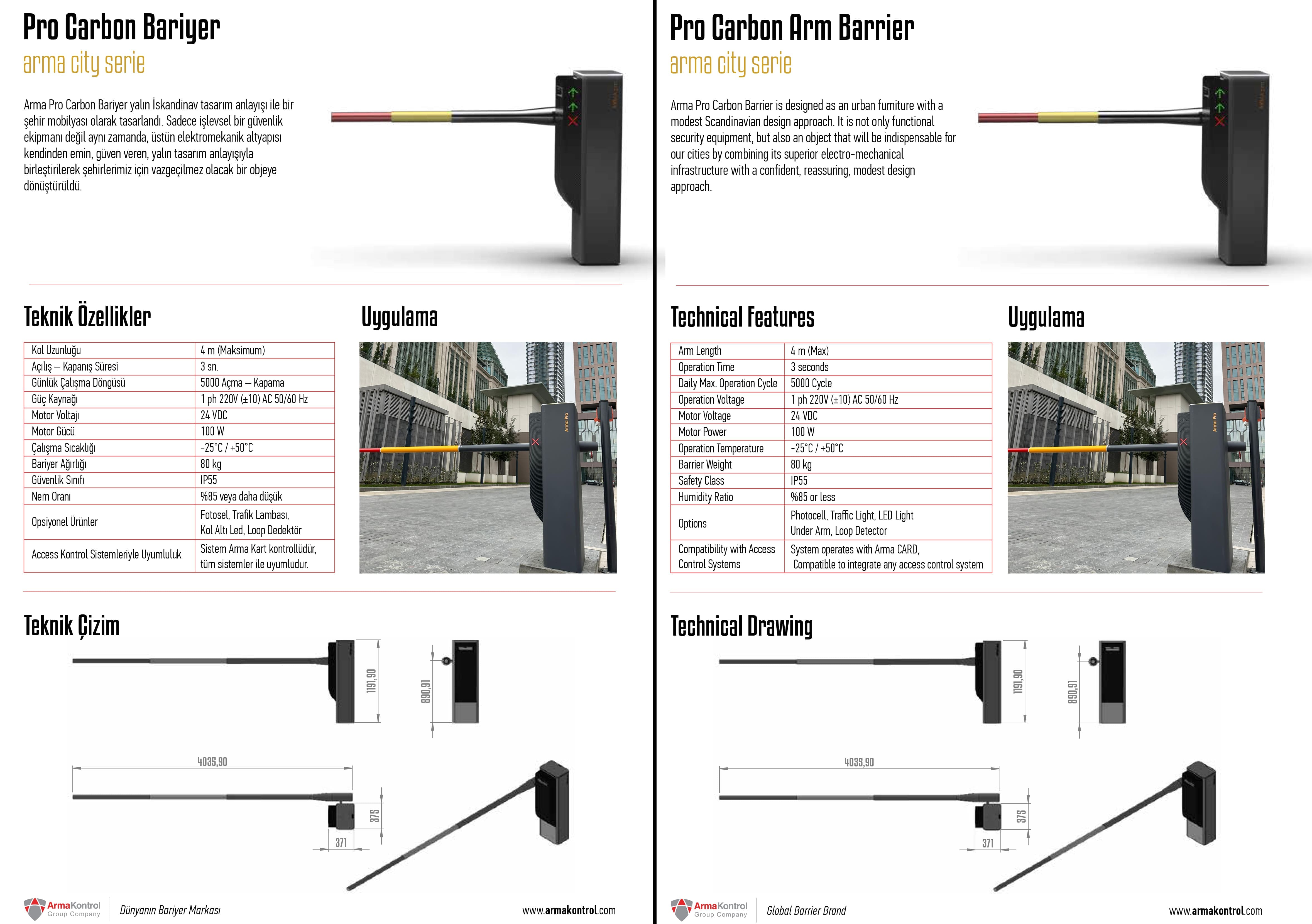 Arma Pro Carbon Kollu Bariyer, yalın İskandinav tasarım anlayışı ve üstün elektromekanik altyapısının birleşimi ile şehirlerimizin ihtiyaçlarına uygun olarak tasarlanmış bir güvenlik ekipmanıdır. TÜV tarafından test edilip belgelendirilmiş olması sayesinde, kalite standartlarına uygunluğu da onaylanmıştır. Şehirlerimizin kontrollü geçişleri için vazgeçilmez bir obje olarak üretilmektedir.