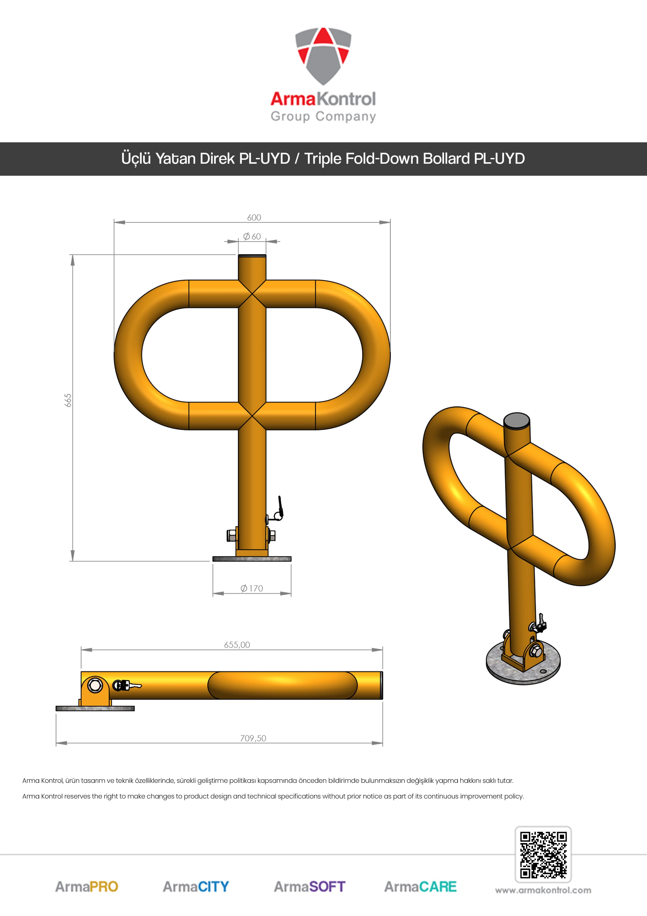 Üçlü yatar direk sistemi mekanizması tekli yatar ürün grubu ile aynı sistemde çalışmakta olup geniş alanları kapatmak, çöp konteynırları vb. alanlardaki araç çarpmasını engellemek gibi farklı amaçlarla da kullanılmaktadır Gece görünmesi için üzerinde reflektif bant bulunmaktadır.