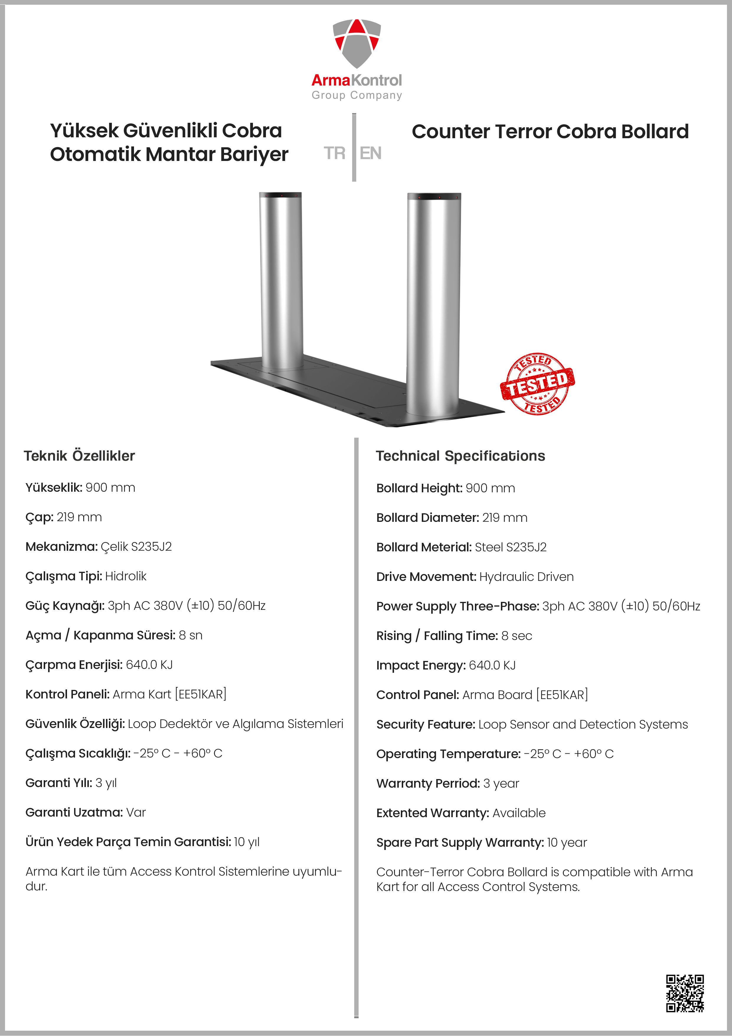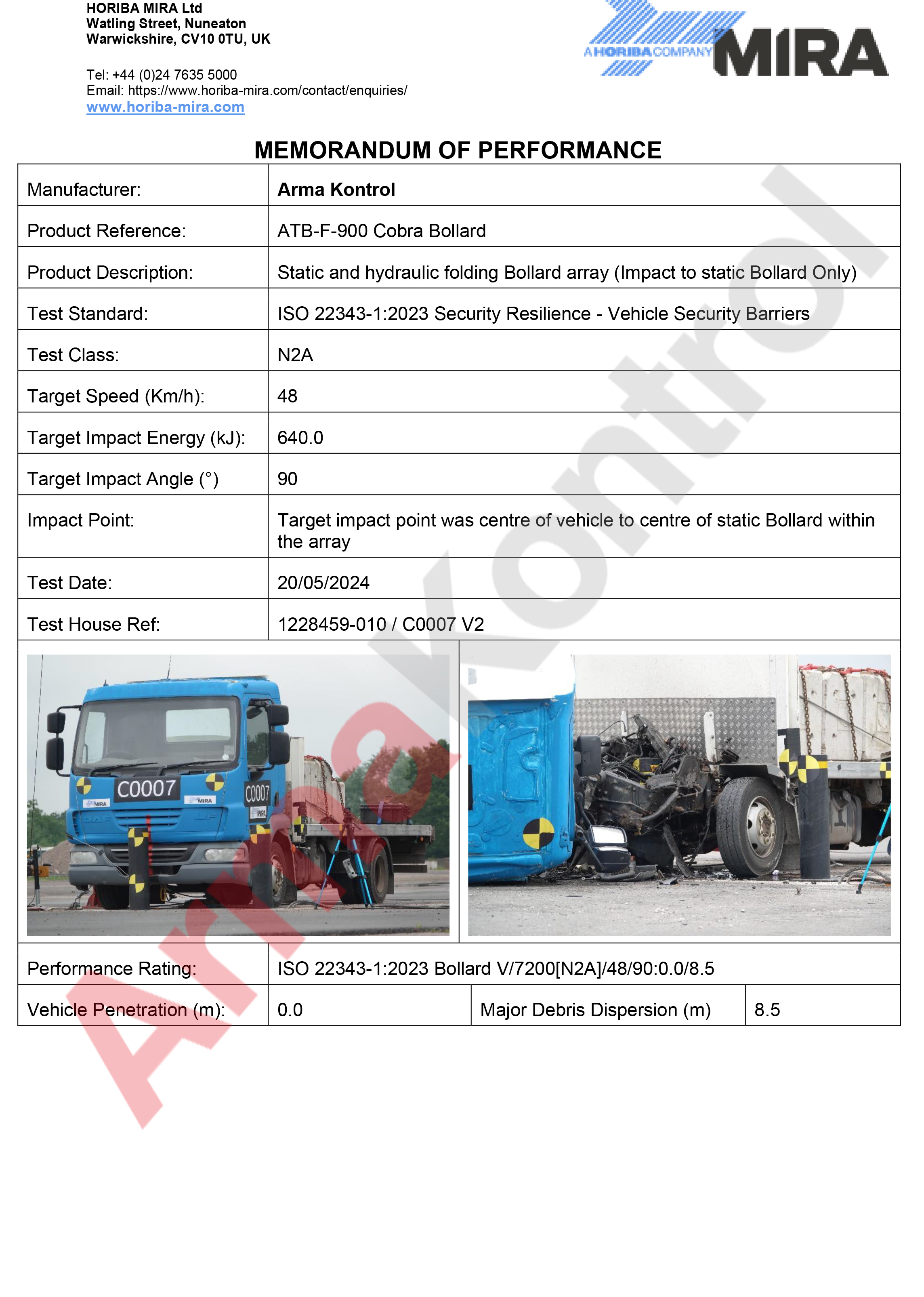 Yüksek Güvenlikli Cobra Otomarik Mantar Bariyer İngiltere MIRA test merkezinde gerçekleştirilen çarpışma testinde 7.500 kg ‘lık (7,5 ton) bir kamyonun saatte 80 km hızla çarpması sonucunda kamyonu durdurmuş ve sonrasında sorunsuz çalışmıştır, test sonucu olarak ISO test raporunu almıştır.