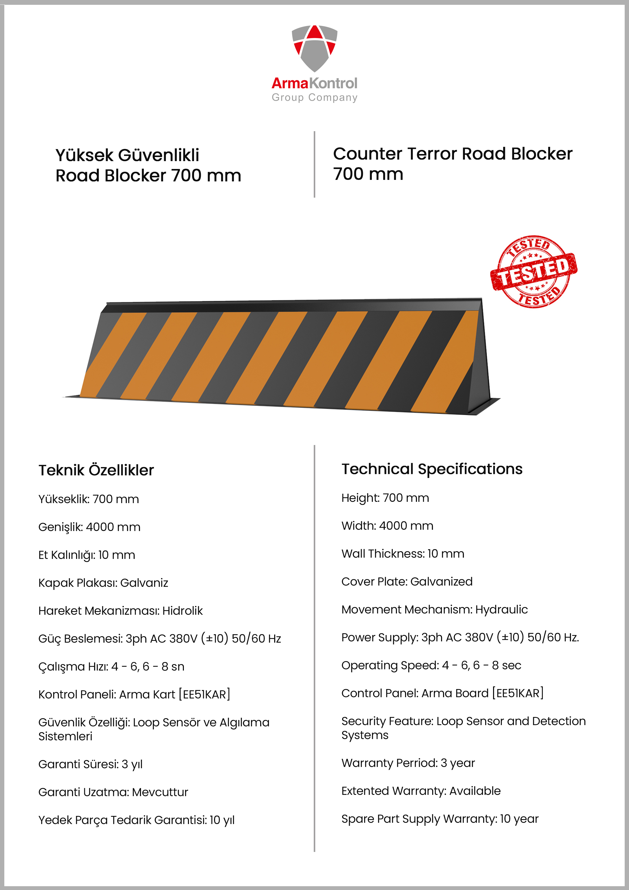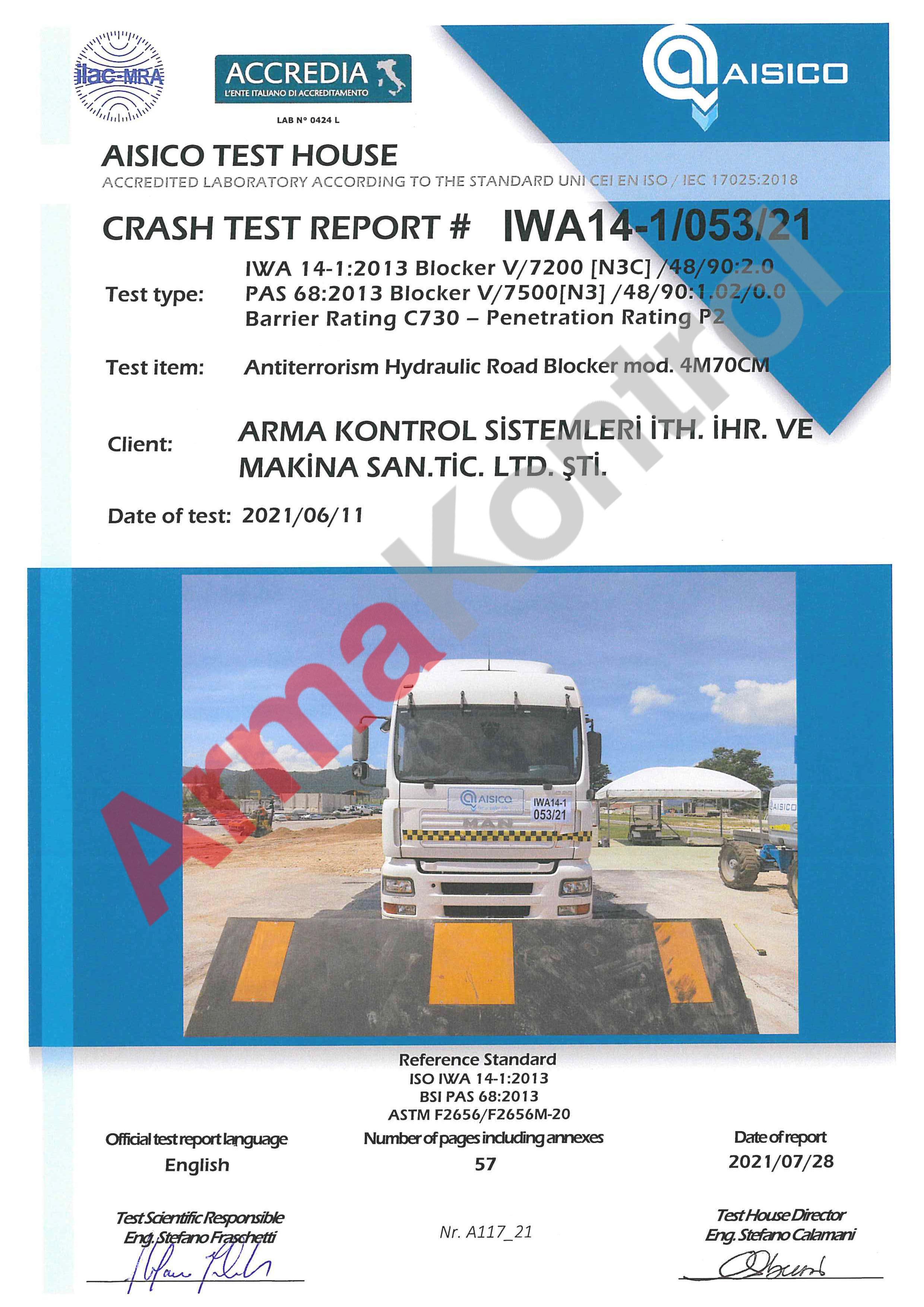 Çarpışma testindeki başarısı sayesinde ürünümüz PAS 68 / IWA 14-1 çarpışma testi sertifikalarını almaya hak kazanmıştır.