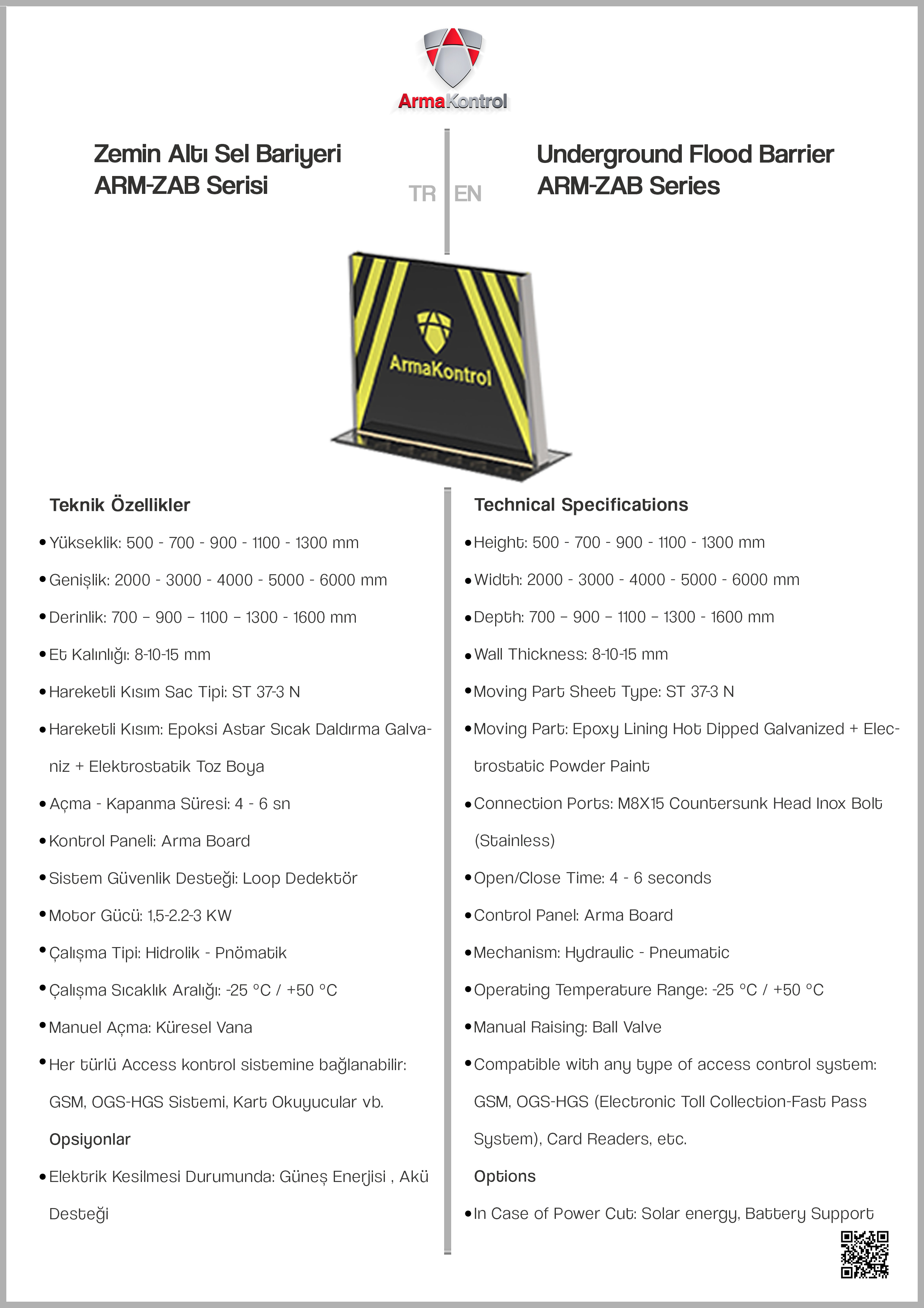 Zemin Altı Sel Bariyeri konumlandırıldığı alanı sel ve taşkınlardan zarar görmesini önlemek amaçlı tasarlanmıştır. Zemin üstü sel bariyerine göre yüksek mukavemetli bir üründür. Ayrıca çevre koruma misyonu ile toprak kayması ve erozyon gibi doğal felaketlere karşıda kalkan görevi görmektedir. Yapılan analizler doğrultusunda rampa sonlarında, eski dere yataklarında, dar cadde, sokaklarda kalan fabrikalarda, sitelerde, kamu kurum ve kuruluşlarında, özel tesis binalarında ve eğimli girişi bulunan garajlarda kullanılmaktadır. Yerinde yapılan ölçümlerle analizlere bağlı olarak, Sel Bariyerinin mukavemet/ölçü hesaplamaları yapılıyor ve müşteriye özel üretim sunuyoruz. Bu kullanımlarının yanı sıra emniyet ve savunma duvarı olarak da büyük kayıpların yaşanmasını engelliyor. Çalışma prensibi hidrolik ve pnömatik olup, 24V(DC) / 220V(AC) / 380V(AC) çalışabilmektedir. Güneş enerjisi ve her türlü Access Kontrol Sistemi (GSM, OGS-HGS Sistemi, Kart Okuyucular vb.) ile entegre çalışmaktadır.